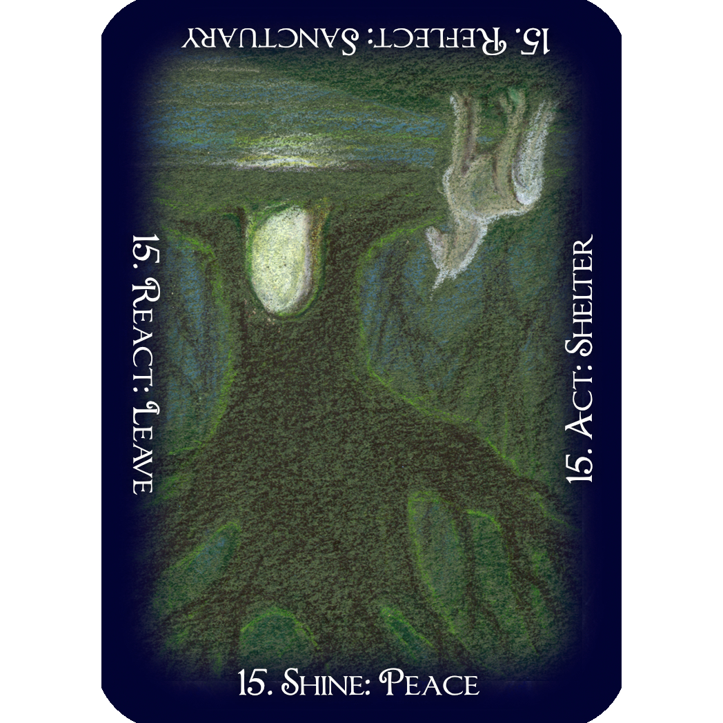 What makes it different? Traditional tarot cards can be drawn in two directions, upright or reversed, but A Unicorn Key can be drawn in any direction! Each side of the card has a different aspect: Act, React, Reflect, or Shine. All four of the guidewords on each card are inter-related, but the way you draw your card can have extra meaning!